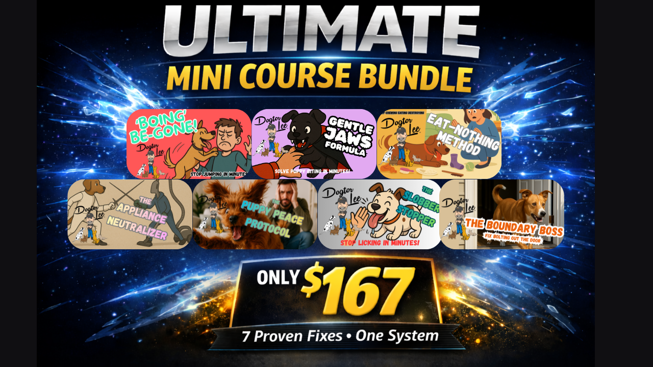 Solve the most common dog behavior problems without long training sessions, treats, or guesswork. This bundle includes 7 short, targeted mini courses designed to fix specific issues using clear rules, proper follow-through, and practical application. Each course is focused and built to produce results fast. These are problem-specific solutions, not a full training system. Theyโre designed to give you quick wins and show you how Dogtor Lee approaches real-world behavior.